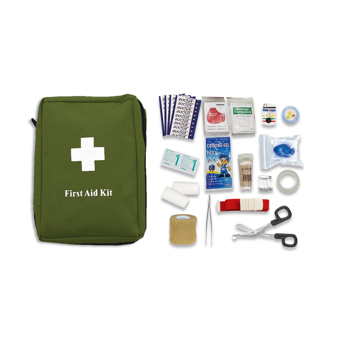 - Tijeras, tiritas, vendaje triangular, venda de compresion elástica, venda, toallitas desinfectantes, bastoncillos, toallita comprimida, imperdibles, parche frío, manta térmica, pinzas, esparadrapo, kit de costura, torniquete elástico con bloqueo y mascarilla RCP